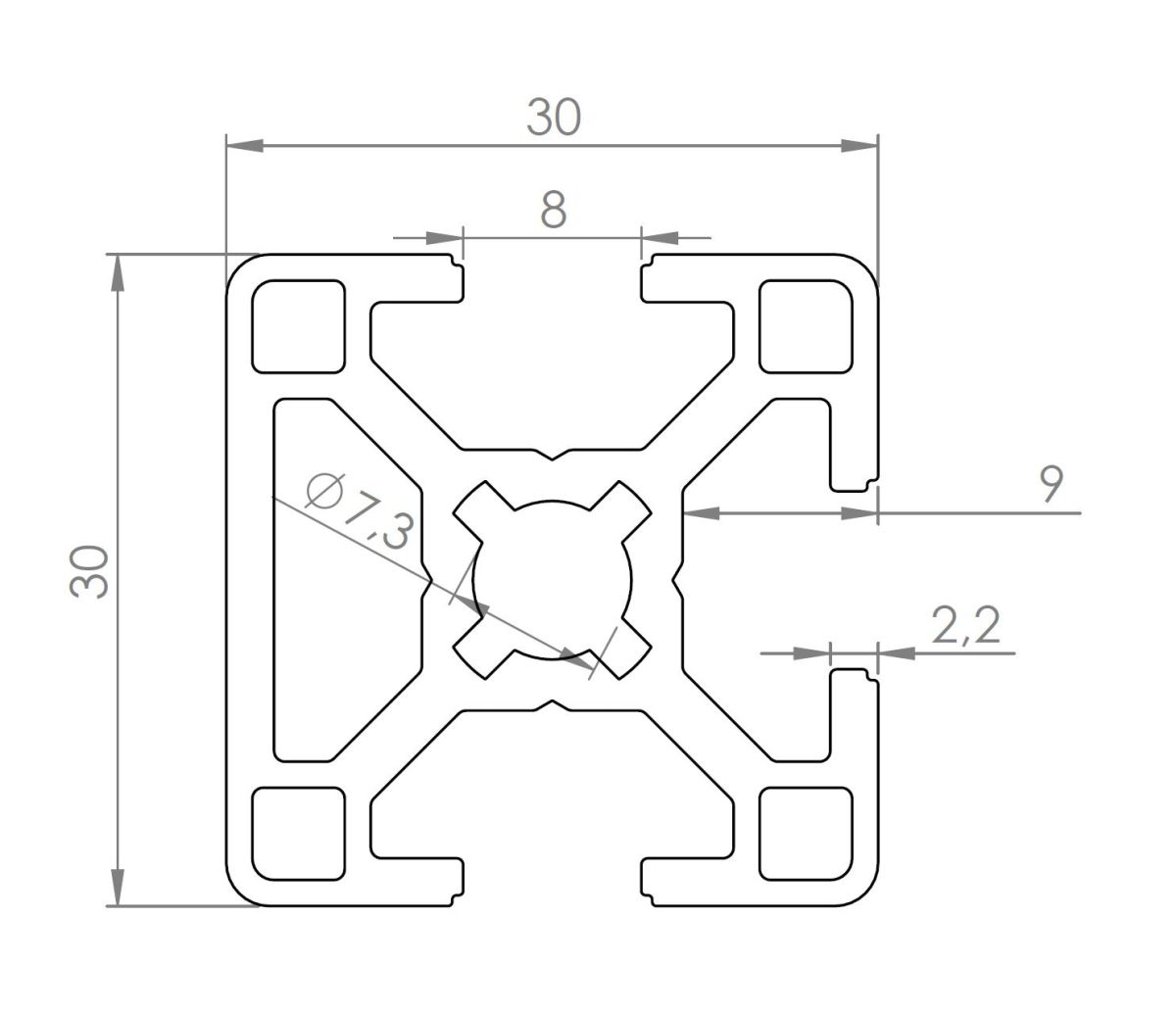 Unser Aluprofil 3030 (30x30) ist 30 mm breit und 30mm hoch. Es hat 3 Nuten mit einer Breite von 8 mm sowie einer Nut tiefe von 9 mm. Der Kern eignet sich zur Aufnahme von ein M8 Gewinde. Das Profil ist in Silber eloxiert.