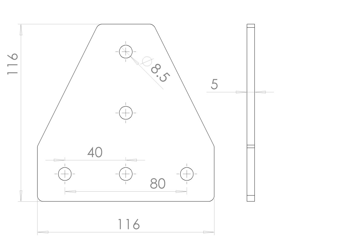 Die gelaserte Verbinderplatte aus festem Aluminium hat eine Dicke von 5 mm und verfügt über fünf Löcher. Einfach mit Befestigungssatz zu bestellen, so kann die Montage leicht durchgeführt werden. Besonders geeichnet für 40-er Profilen. Unter der Tab „Befestigungssatz“ finden Sie den richtigen Befestigungselementen für diesen Verbinder.