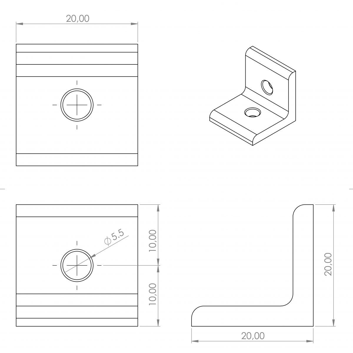 Dieser Winkel wird aus leichtem Aluminium hergestellt und hat eine eloxierte Oberfläche. Damit bietet sie mehr Widerstand gegen äußere Umweltfaktoren wie Feuchtigkeit, Korrosion oder Rost. Insgesamt verfügt der Winkel mit der Größe 20 x 20 über zwei Löcher, mit denen die Fixierung einfach durchgerührt werden kann. Das Modell eignet sich perfekt für die rechtwinklige Verbindung zwei Profile. Dieser Verbindungswinkel ist silber eloxiert und anschließend schwarz pulverbeschichtet.
