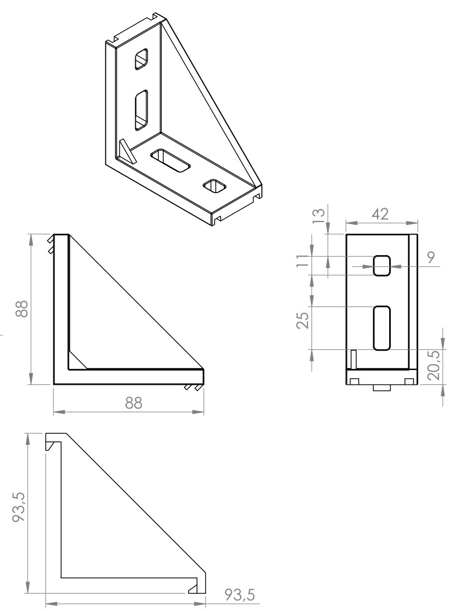 Diese Winkel 4590, aus Aluminiumguss ist 42 mm breit und 88 mm hoch. Die Winkel kann mit passender Abdeckkappe bestellt werden. Die Zentriernasen an der Winkel sind 8/10 mm breit. Die Zentriernasen können leicht mit einem Schlitzschraubendreher abgebrochen werden, für der Befestigung quer zur Nut oder auf Platten.